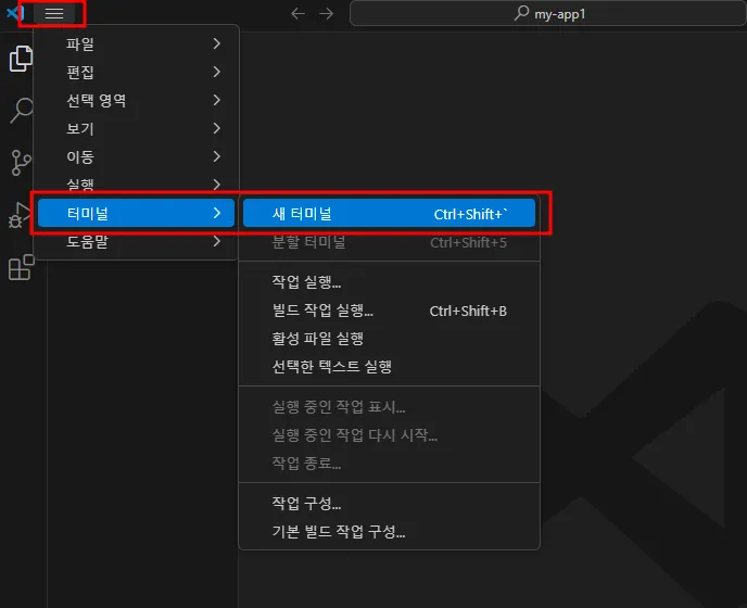 비주얼 스튜디오 코드에서 터미널 > 새 터미널을 클릭하면 프로그램 내에서 터미널을 실행 할 수 있다.