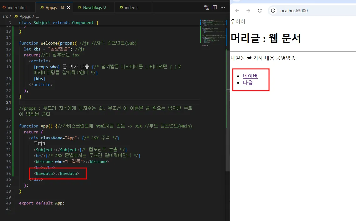 Navdata.js 를 import 한 후 , App function 내부에서 <Navdata></Navdata> 로 호출해주었다
