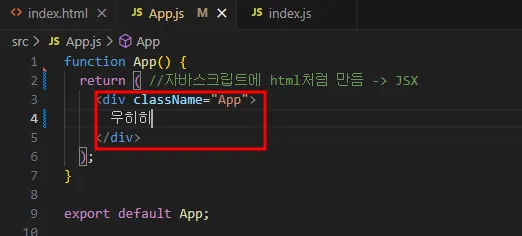 그리고 App.js는 index.js에 import되어 활용되고 있었다.