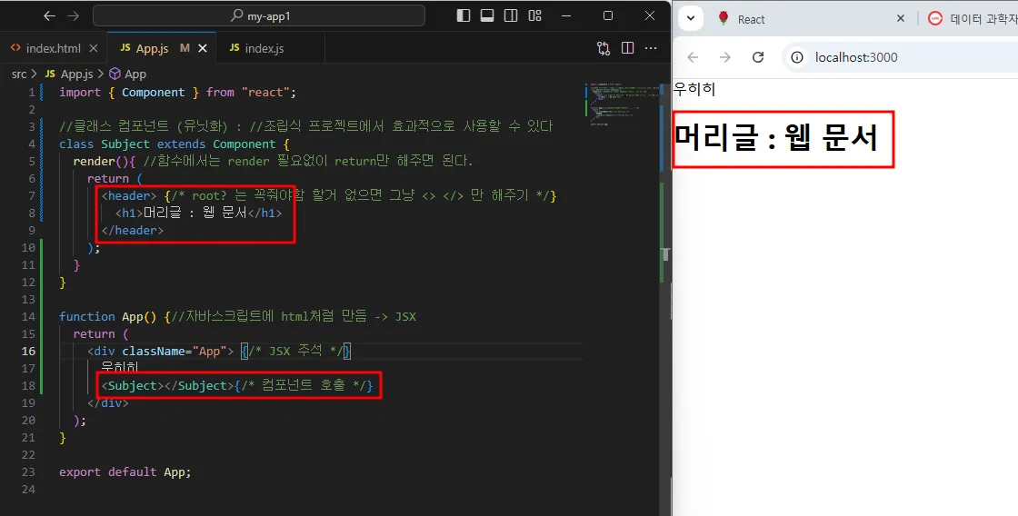 함수 외부에서 Component를 상속받은 클래스를 생성하였고 클래스 내부에서 코드를 작성한 다음, App 함수에서